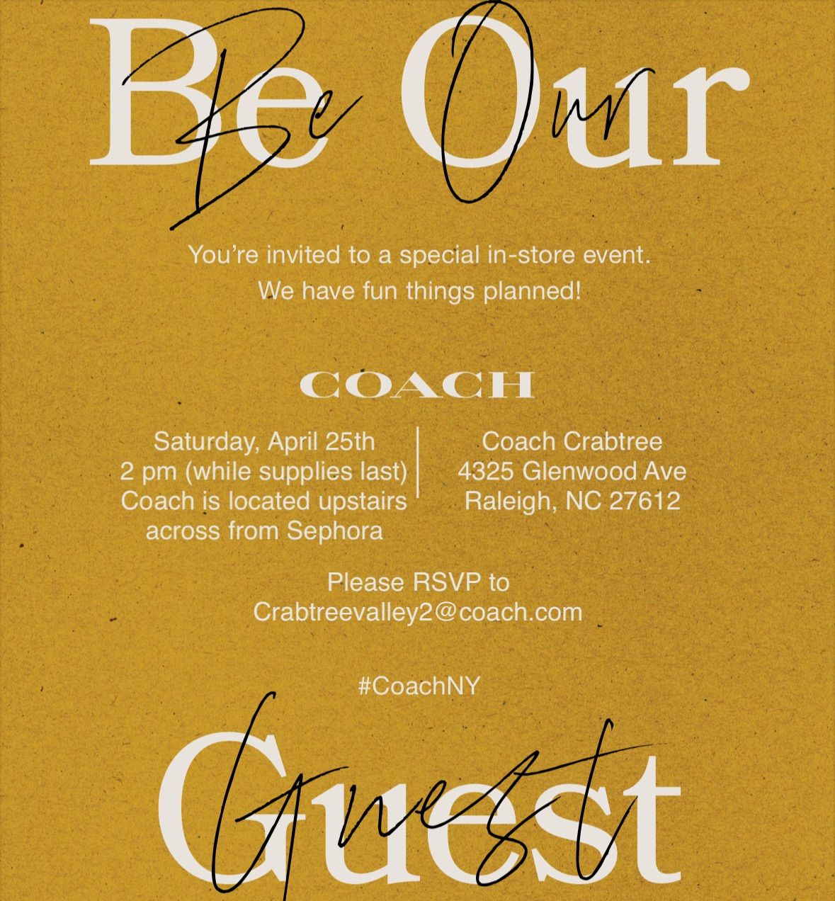 Please join us in store at Coach Crabtree on Saturday, April 25th at 2 pm to enjoy a DIY bouquet experience with fresh blooms, complimentary with a qualifying purchase, while exploring our newest arrivals. Our collection will be available to shop all day, and the DIY bouquet experience will be offered while supplies last.